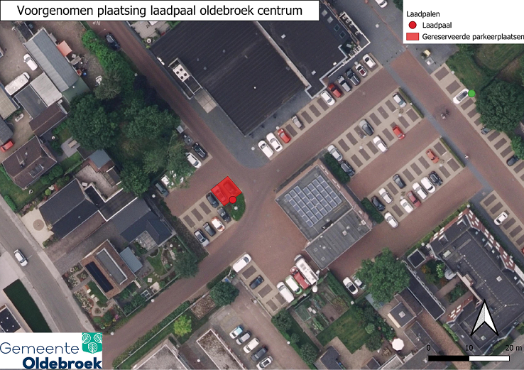 - door middel van het plaatsen van het verkeersbord E8c van bijlage 1 van het RVV 1990 met een onderbord met pijlen, waaruit blijkt dat het bord voor twee parkeerplaatsen van toepassing is, aan de Zuiderzeestraatweg in Oldebroek, nabij de oude brandweerkazerne, een tweetal parkeerplaatsen te reserveren ten behoeve van het opladen van elektrische voertuigen, zoals aangegeven op bijgaande situatietekening.