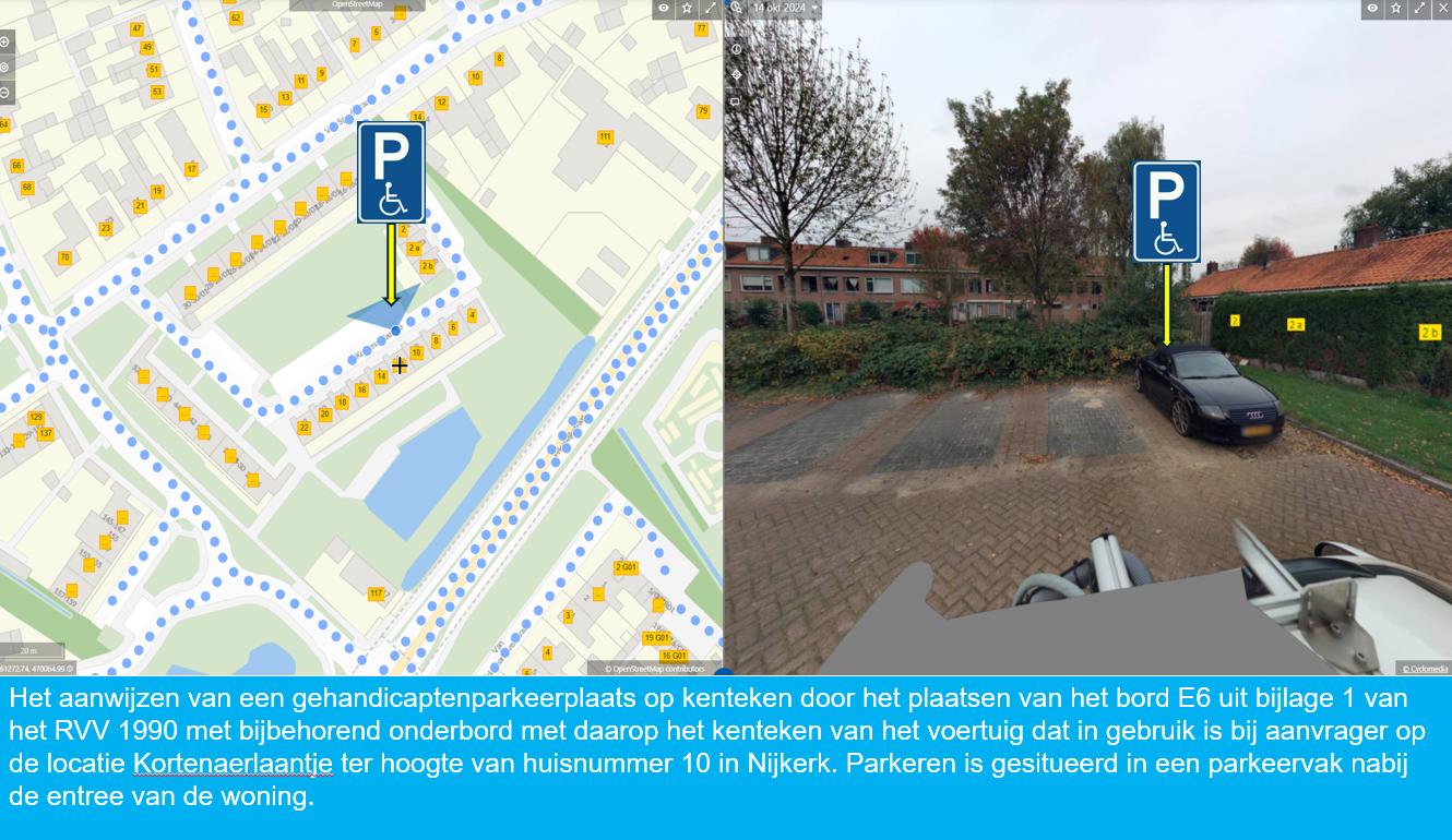 Het aanwijzen van een gehandicaptenparkeerplaats op kenteken door het plaatsen van het bord E6 uit bijlage 1 van het RVV 1990 met bijbehorend onderbord met daarop het kenteken van het voertuig dat in gebruik is bij aanvrager op de locatie Kortenaerlaantje ter hoogte van huisnummer 10 in Nijkerk;