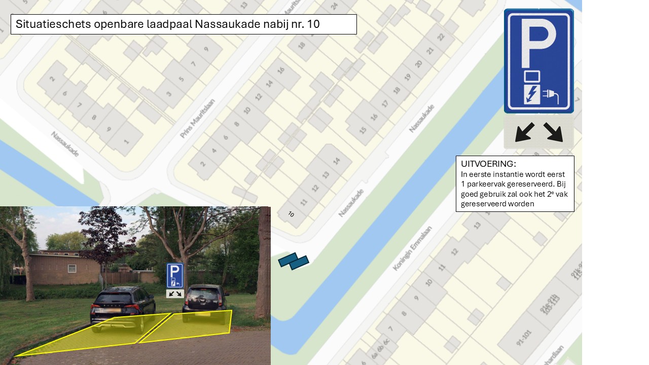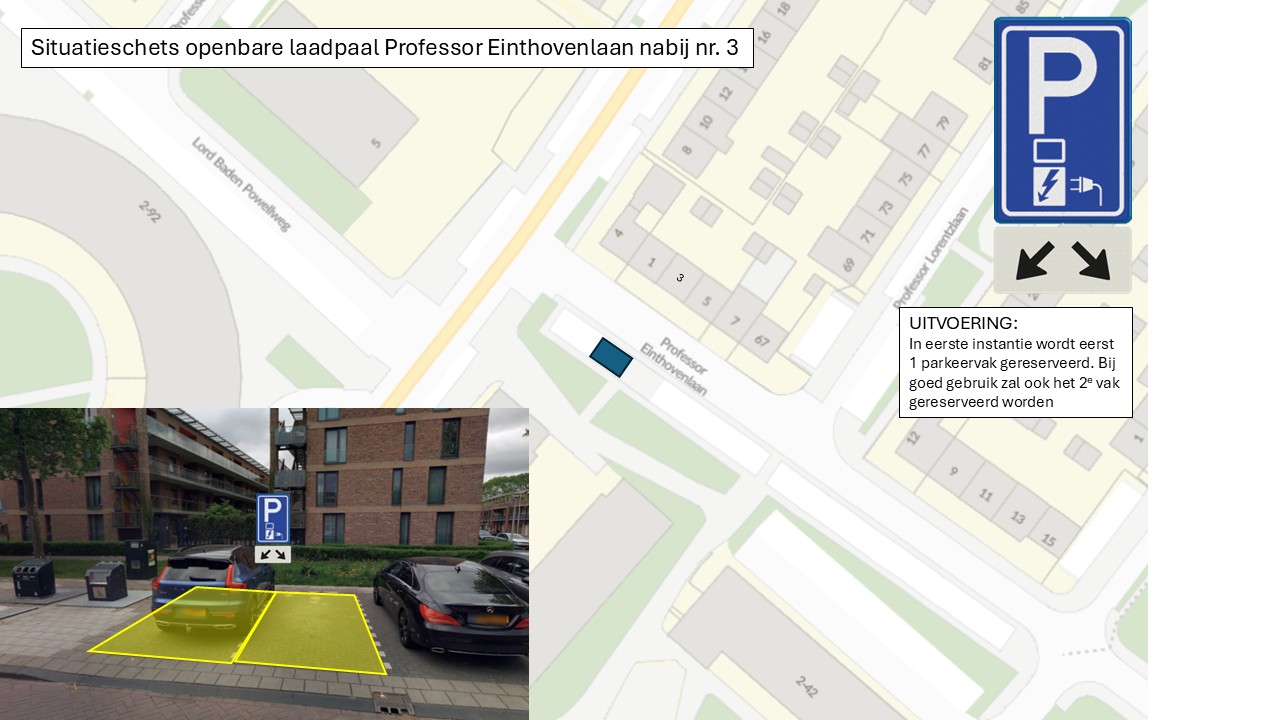 door het plaatsen van bord E8c van Bijlage 1 van het Reglement verkeersregels en verkeerstekens 1990 met het onderbord (OB504) dat met twee pijlen aangeeft op welke vakken het betrekking heeft, waarbij in eerste instantie maar een pijl wordt geplaatst en daarmee op de volgende vier locaties parkeerplaatsen aan te wijzen die het opladen van elektrische voertuigen als specifiek doel hebben: