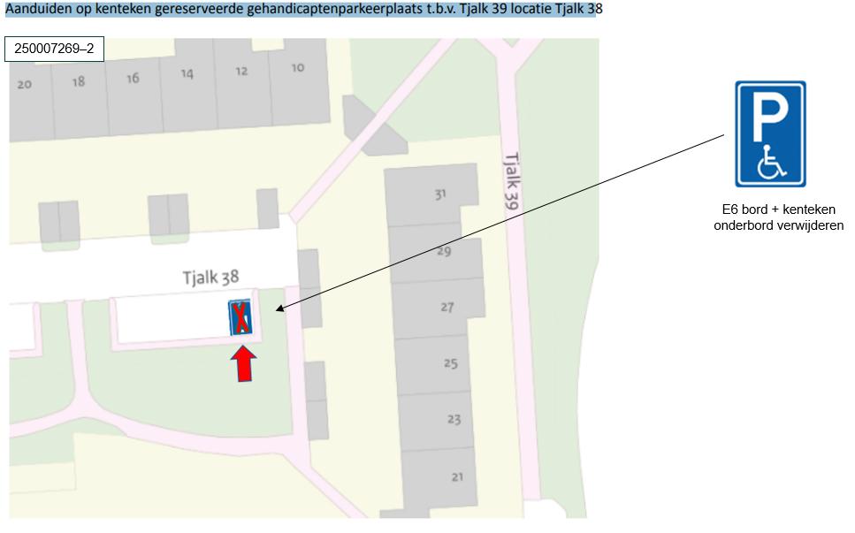 Opheffen op kenteken gereserveerde gehandicaptenparkeerplaats t.b.v Tjalk 39 locatie Tjalk 38 te Lelystad door het verwijderen van het bord E6 (gehandicaptenparkeerplaats) van bijlage 1 van het Reglement verkeersregels en verkeerstekens 1990 en het verwijderen van het kentekenonderbord.