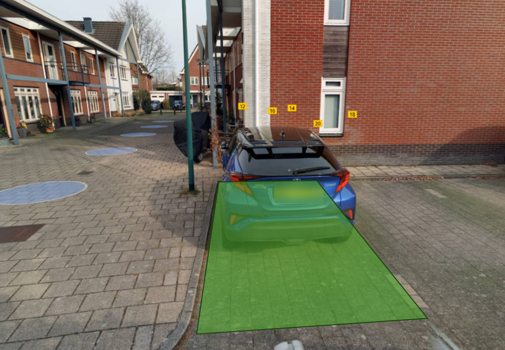 b. aan te geven door het plaatsen van verkeersbord E6, conform bijlage 1 van het RVV 1990 met het kenteken van de aanvrager op het onderbord;