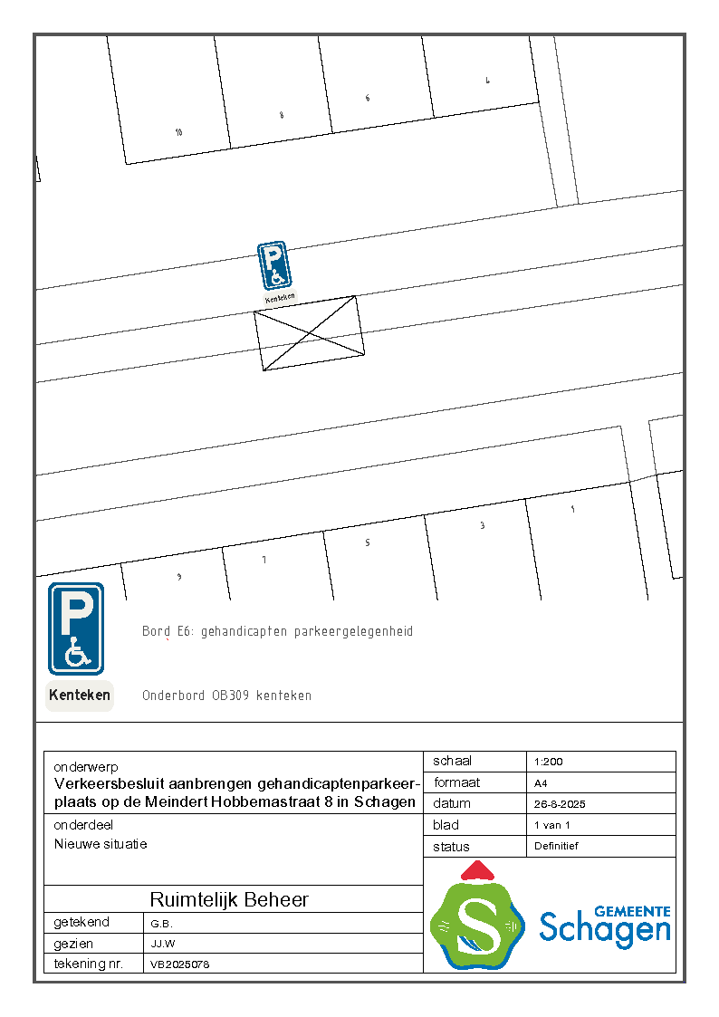 Gemeente Schagen- Verkeersbesluit gehandicaptenparkeerplaats op kenteken nabij Meindert Hobbemastraat 8, Schagen.