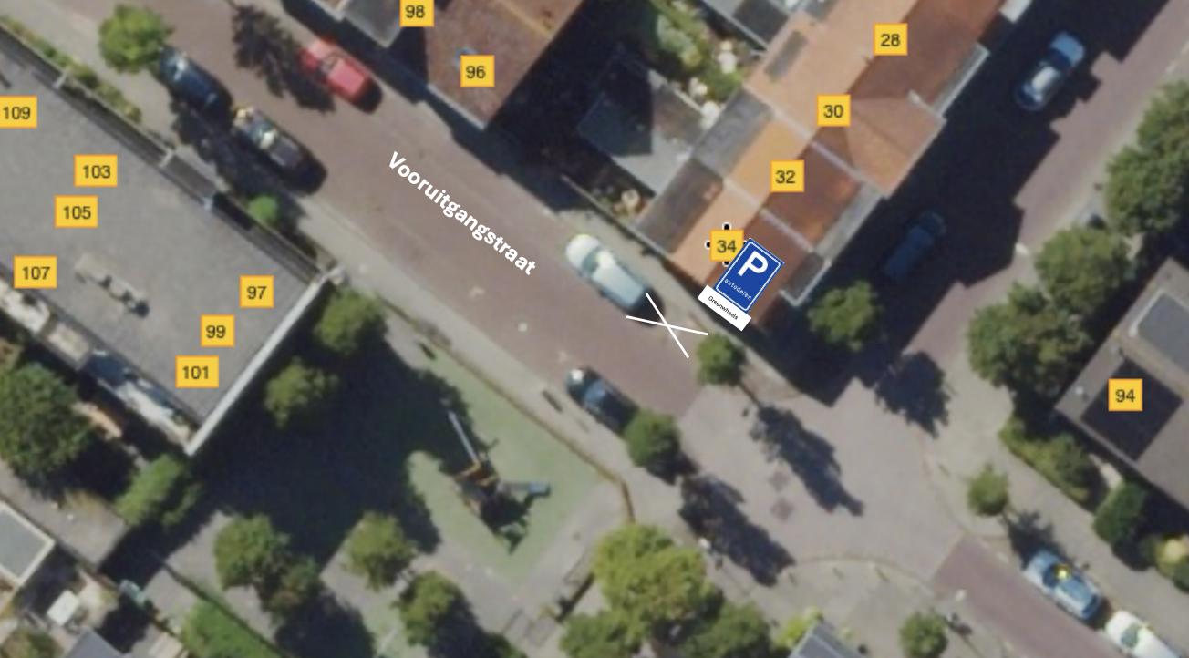 dat het parkeervak, conform de richtlijnen van het CROW verbijzonderd dient te worden met een kruismarkering en parkeervakmarkering;