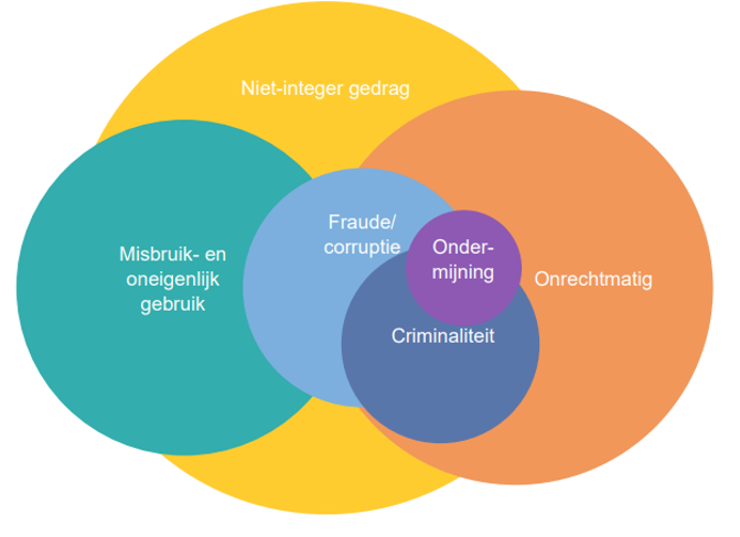 Het fraudebeleid is primair gericht op het voorkomen of signaleren van (vermoedens van) fraude. Met fraude hangen echter een aantal andere begrippen samen die deels overlappen met fraude en ook vormen zijn van een niet-integer gedrag. Hieronder is de relatie tussen deze begrippen weergegeven, waarna voor een aantal begrippen een definitie en uitleg is opgenomen.
