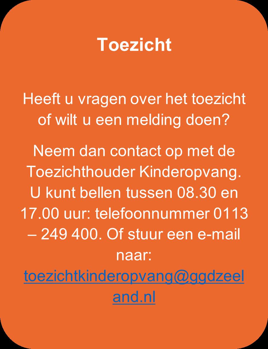 De toezichthouder deelt ook zelf signalen met andere toezichthouders in de kinderopvang. Dit zijn bijvoorbeeld de Nederlandse Voedsel- en Warenautoriteit en gemeentelijk toezicht op het gebied van brandveiligheid. Ook kan de toezichthouder signalen delen met toezichthouders kinderopvang in een andere GGD-regio.
