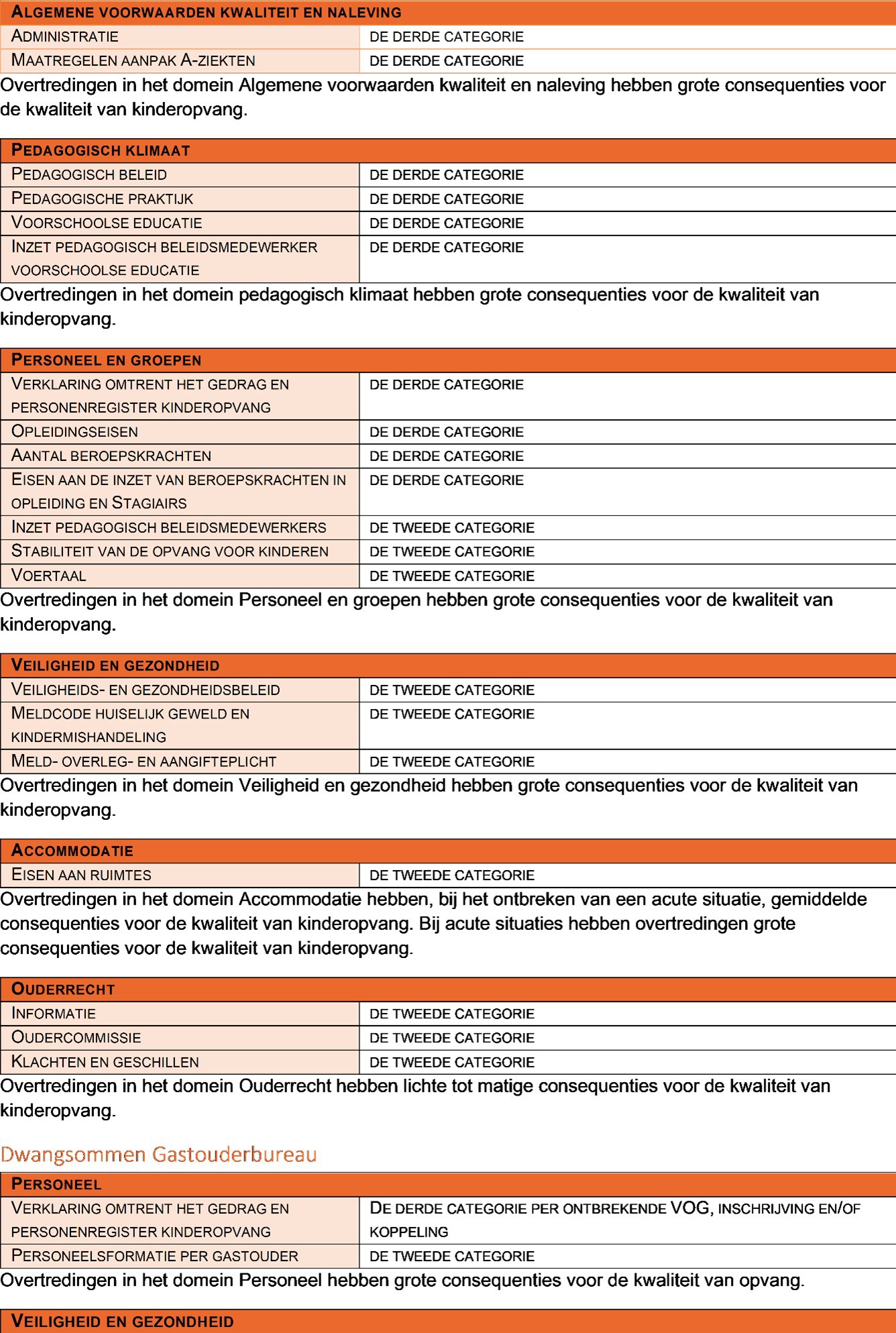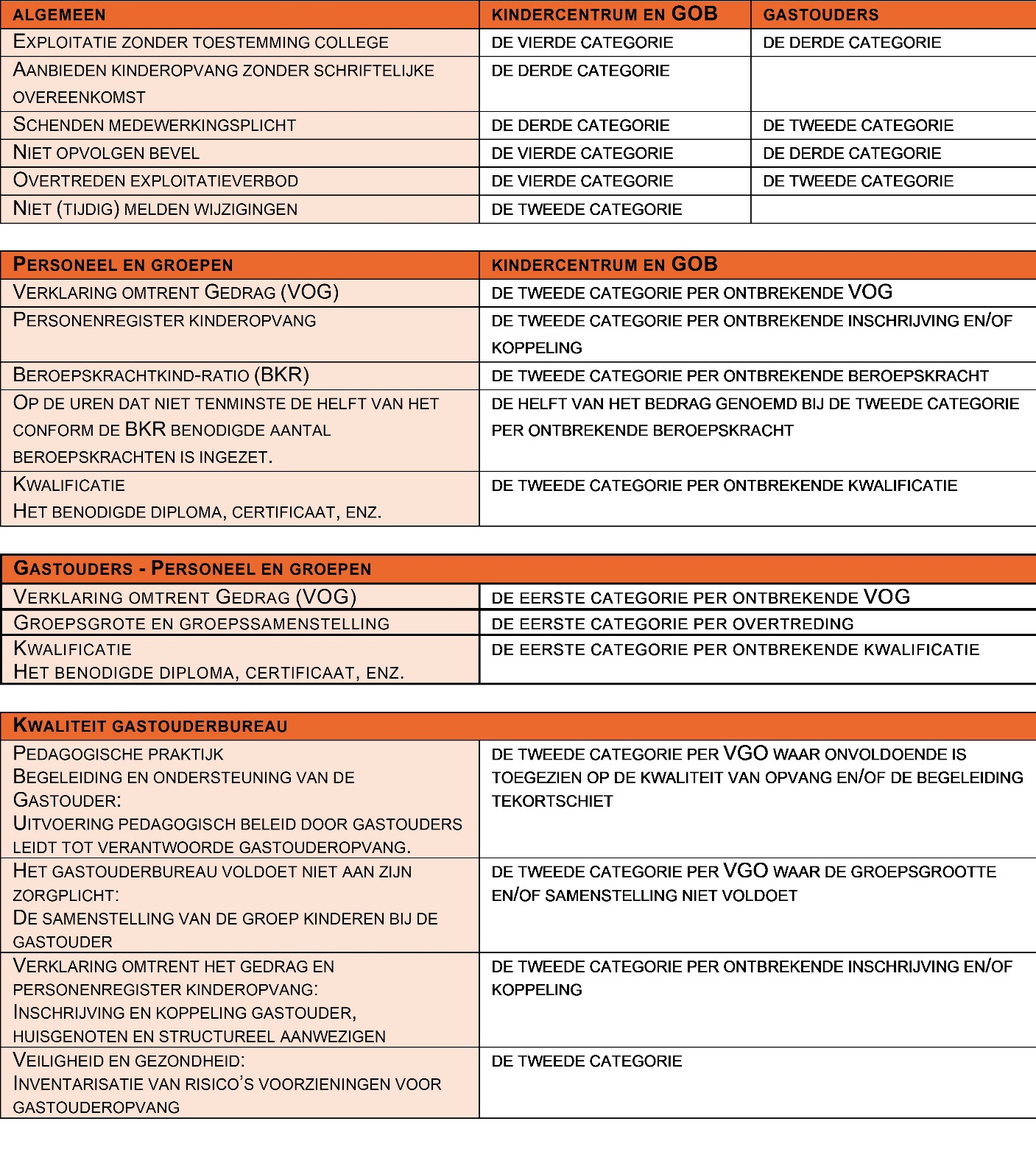 Voor de bedragen sluit het college aan bij de categorieën genoemd in artikel 23 lid 4 van het Wetboek van Strafrecht. Gezien de ernst van het niet aanbieden van kinderopvang die voldoet aan de minimale kwaliteitseisen is met name aangesloten bij de tweede, derde en vierde categorie. Een financiële sanctie is nooit lager dan het genoemde bedrag uit de eerste categorie. Voor de gastouderopvang, met uitzondering van de gastouderbureaus, en de ouderparticipatiecrèches wordt hierop een uitzondering gemaakt. Daar gelden andere bedragen.