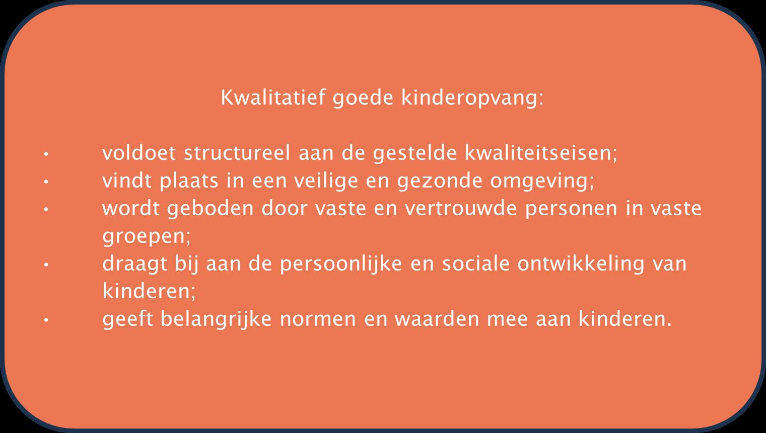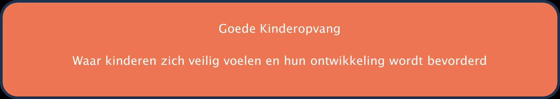Kinderopvang heeft een belangrijke plaats in onze samenleving. Kwalitatief goede kinderopvang draagt bij aan een goede start voor kinderen in de maatschappij en draagt bij aan een goede ontwikkeling en aan het welbevinden van kinderen. In de kinderopvang moeten kinderen zich veilig voelen en de ruimte krijgen om zich te ontwikkelen (denk aan sociale emotionele-, cognitieve- en taalontwikkeling). Het gaat daarbij om een brede ontwikkeling met aandacht voor sociale activiteiten zoals samen spelen, samenwerken en leren van en met elkaar. Zo draagt kinderopvang bij aan een goede start voor kinderen in het basisonderwijs en de samenleving.