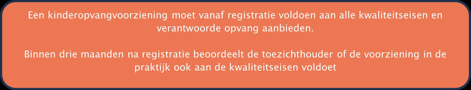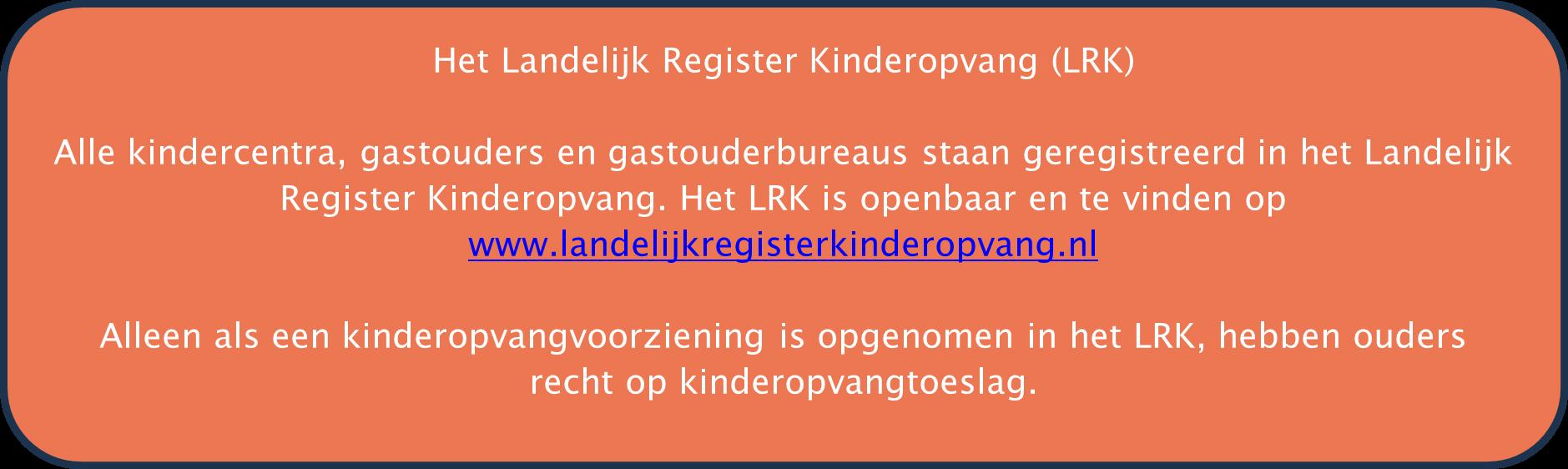Het bevorderen van de ontwikkeling van kinderen. De houder van een kinderopvangvoorziening is verantwoordelijk voor het leveren van kwalitatief goede kinderopvang. Het is belangrijk dat direct vanaf de start van een opvanglocatie verantwoorde en kwalitatief goede kinderopvang wordt aangeboden. Ouders moeten erop kunnen vertrouwen dat ze hun kind in een veilige en gezonde, stimulerende en vertrouwde omgeving achterlaten. In het Landelijk Register Kinderopvang (LRK) staan alle organisaties die toestemming hebben gekregen om kinderopvang aan te bieden. In het register staan de contactgegevens van de organisaties, de onderzoeksrapporten van de toezichthouder en de handhavingsmaatregelen die het college heeft genomen.