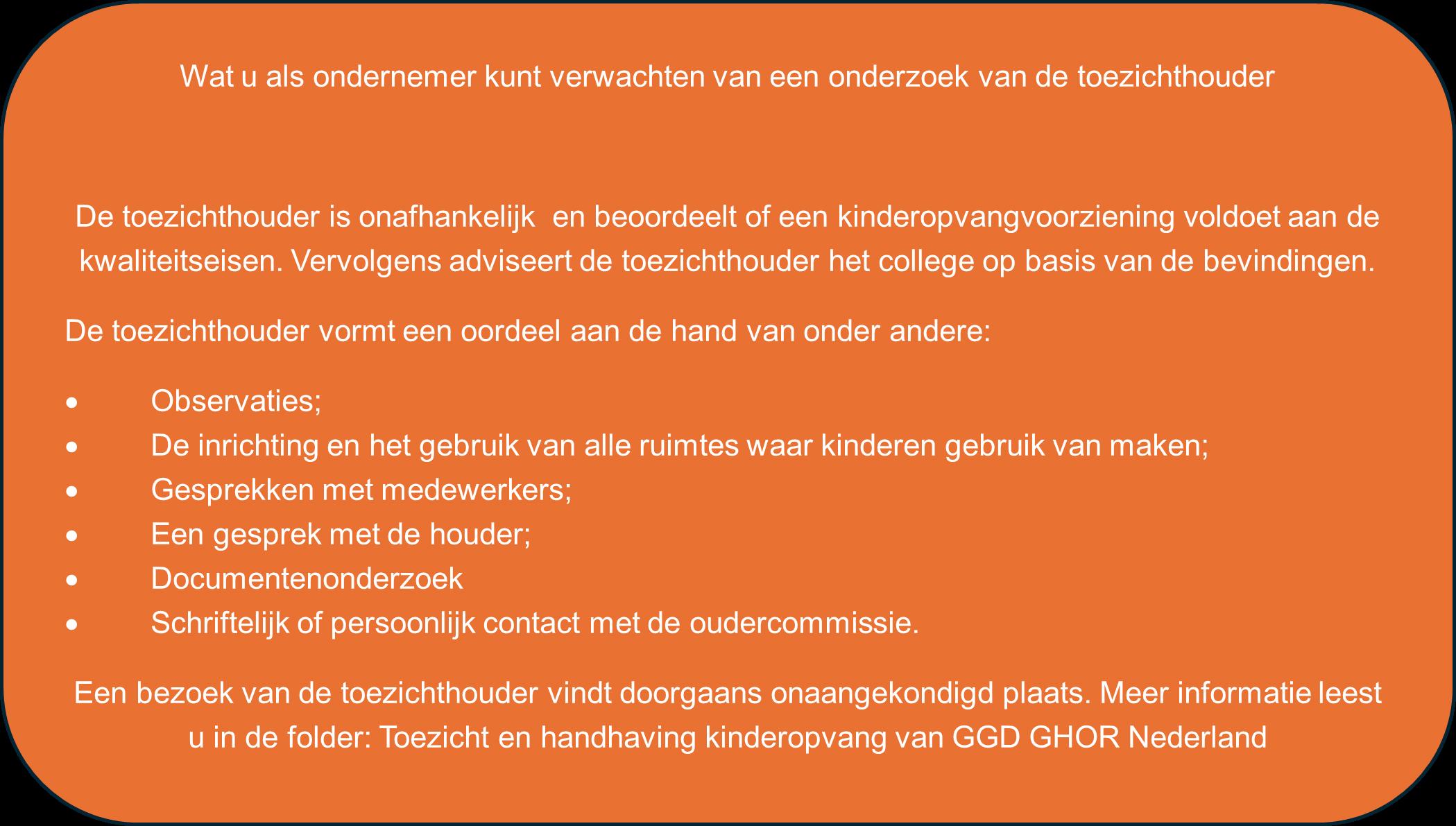 De toezichthouder zet kinderopvangorganisaties aan om (samen) te werken aan de kwaliteit en veiligheid van hun opvang en risico’s te verminderen. Daar waar nodig worden verbeterpunten besproken en zet de toezichthouder houders aan om de kwaliteit van hun opvang te verbeteren. Wanneer sprake blijkt van een tekortkoming is van belang om te weten wat de omstandigheden zijn en wat de inbreuk was op de geboden kwaliteit van opvang. Dit weegt de toezichthouder mee in zijn oordeel en advies aan het college.