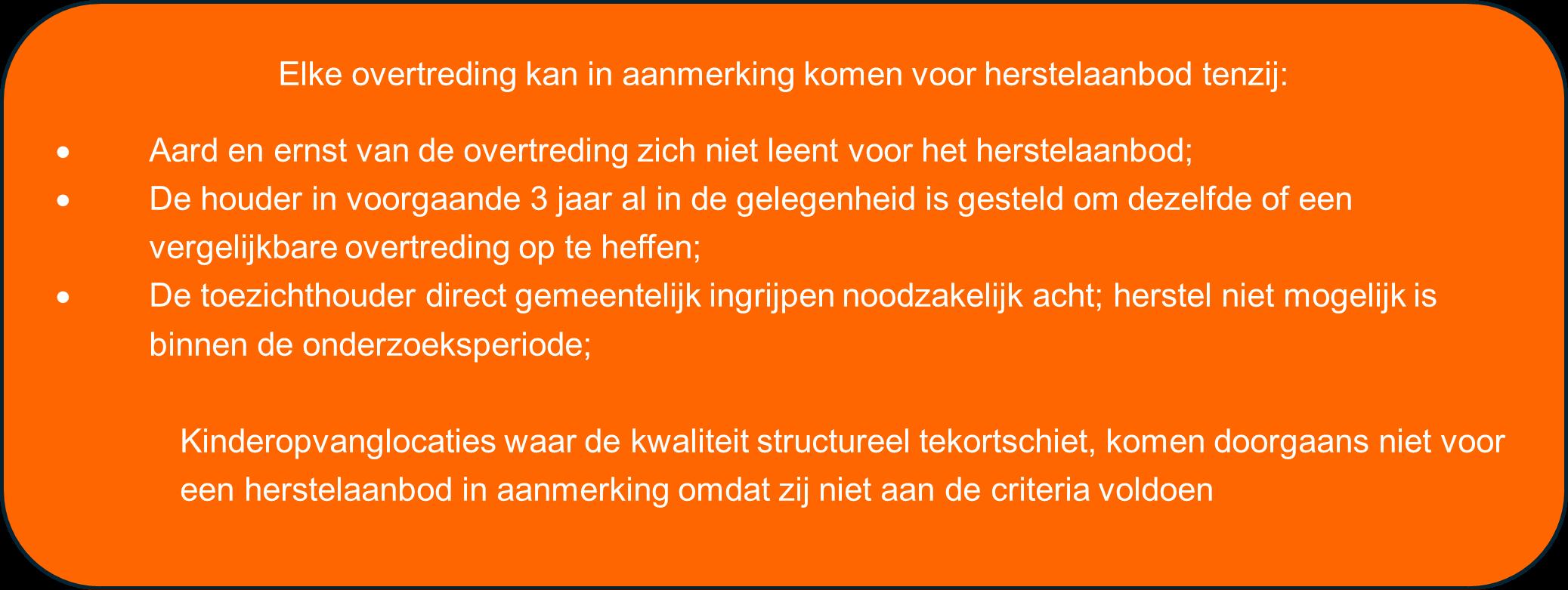 De toezichthouder kan een houder van een kinderopvangvoorziening de gelegenheid bieden om vastgestelde overtredingen nog tijdens de onderzoeksperiode op te heffen (het herstelaanbod). Als de houder de overtreding al heeft hersteld of redelijkerwijs snel zal herstellen, kan het college besluiten af te zien van handhaving gericht op herstel.