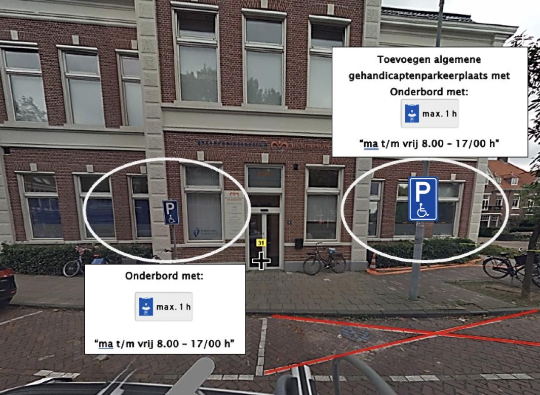 door middel van het plaatsen van bord E6 van bijlage 1 van het RVV 1990 en onderbord waarop de tekst “ma t/m vrij 08:00-17:00 h” en onderbord met het opschrift “parkeerschijficoon max. 1 h”, een algemene gehandicaptenparkeerplaats met venstertijden en een maximumparkeerschijfduur van 1 uur in te stellen, aangrenzend aan de huidige algemene gehandicaptenparkeerplaats, ter hoogte van de Koninginneweg 31 en de kruising met de Eerste Emmastraat;