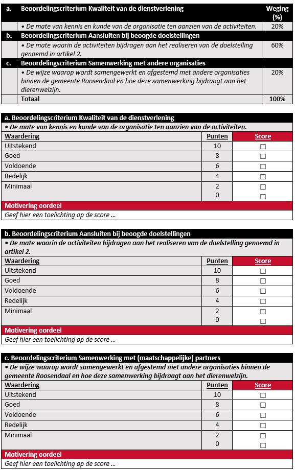 Aan de in het eerste lid vermelde criteria wordt een score toegekend met toepassing van een wegingsfactor zoals vermeld op het bijgevoegde vastgestelde beoordelingsformulier. Dit beoordelingsformulier maakt onderdeel uit van deze subsidieregeling.