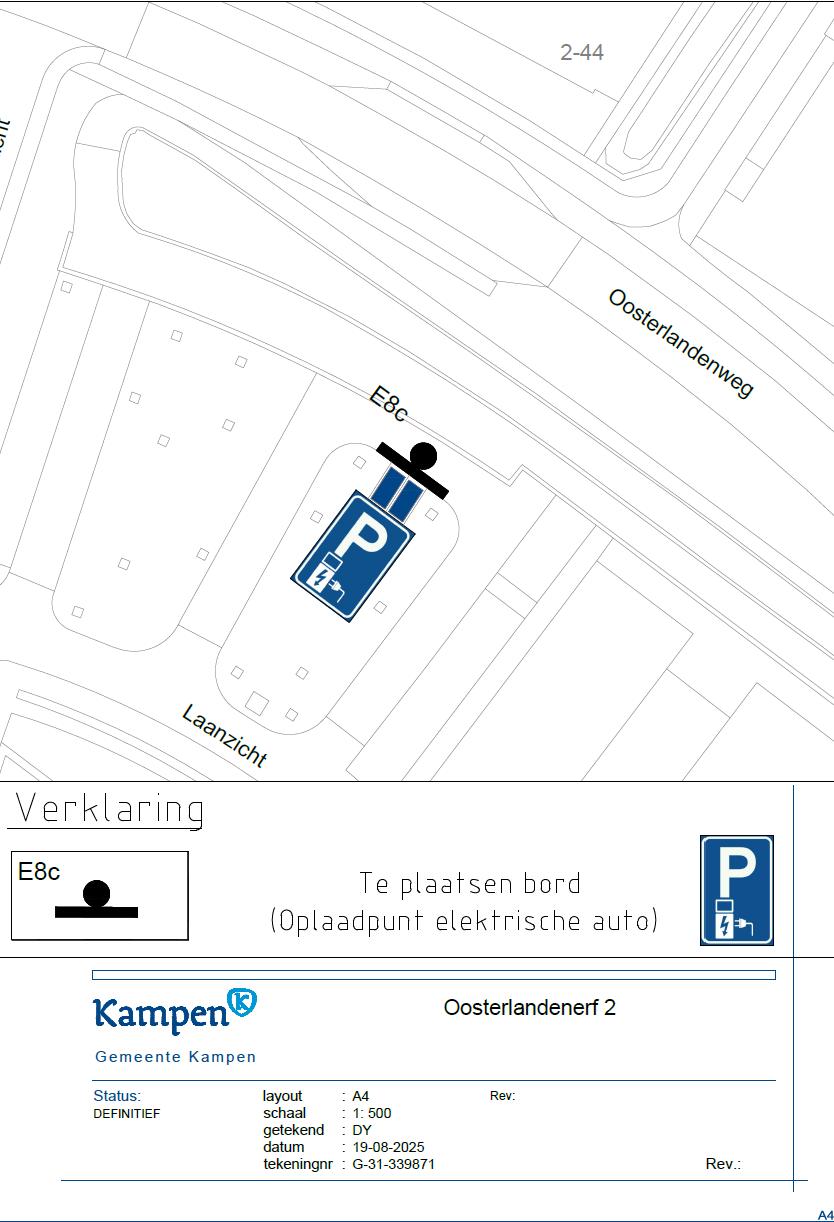 - dat dit gerealiseerd kan worden door middel van het plaatsen van het verkeersbord E8c van bijlage 1 van het RRV 1990 met een onderbord met de tekst ‘alleen opladen elektrische voertuigen’ en een onderbord dat aanduidt dat het verkeersbord van toepassing is op twee parkeervakken;