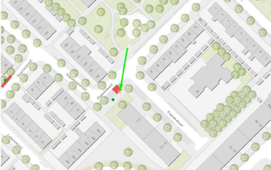 Pagodedreef (ter hoogte van zijgevel huisnummer 1; wegvak tussen Yokahamadreef en Pagodedreef huisnummer 53)