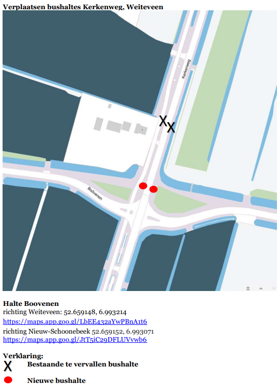 De twee bushaltes aan de Kerkenweg te Weiteveen, ter hoogte van huisnummer 1, worden verplaatst richting het kruispunt met Boôvenen. De nieuwe haltes worden toegankelijke haltevoorzieningen. Dit zijn verhoogde bushaltes met blindengeleidestroken met daarnaast een fietsenstalling. Dit wordt gedaan om tijdens de werkzaamheden het OV bereikbaar te houden.