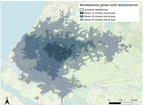 Voor de bedrijventerreinen is de bereikbaarheid in kaart gebracht voor zowel het station als per auto. Hierbij is Logistiek Park A12 als uitgangspunt genomen. De bereikbaarheid van Coenecoop is vergelijkbaar met Logistiek Park A12. De bedrijventerreinen hebben een belangrijke economische functie en zijn goed bereikbaar voor het autoverkeer, zoals te zien is in Figuur 13. Dit maakt de terreinen aantrekkelijk voor bedrijven én forensen. Dankzij snelle autoverbindingen zijn grote steden als Rotterdam, Den Haag en Utrecht binnen 45 minuten bereikbaar. Hierdoor is Waddinxveen een aantrekkelijke woonplaats voor mensen die in deze steden werken, maar met de auto reizen. De goede verbindingen zorgen ervoor dat forensen gemakkelijk naar belangrijke economische centra kunnen reizen. Dat maakt Waddinxveen interessant om te wonen en te werken.