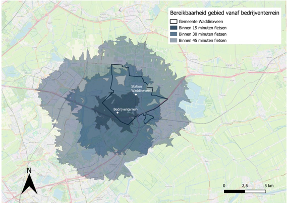 Naast de autobereikbaarheid is ook de fietsbereikbaarheid in kaart gebracht. Figuur 14 toont aan dat het bedrijventerrein relatief goed bereikbaar is per fiets voor omliggende steden. Voor grote delen van Gouda en Zoetermeer is het park bereikbaar binnen 45 minuten. Werknemers die in Waddinxveen wonen kunnen het bedrijventerrein binnen 30 minuten bereiken.