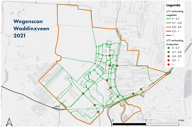 Knelpunten ontstaan op locaties waar de intensiteit (I) van het verkeer hoger is dan de capaciteit (c) van de weg en vervolgens opstoppingen ontstaan. Uit het verkeersmodel blijkt dat de grootste knelpunten voorkomen op de kruispunten van de N451 en N452 (Goudse Poort), de N457 (Vredenburghlaan), en langs de Noord-zuid route door Waddinxveen (Juliana van Stolberglaan, Kanaalstraat, Kanaaldijk) en bij de Hefbrug (Figuur 17). De bestaande infrastructuur kan het huidige verkeersaanbod op deze locaties niet efficiënt verwerken, wat leidt tot in langere en onbetrouwbare reistijden. Deze knelpunten veroorzaken vertragingen die mogelijk op korte termijn al om oplossingen vragen om verdere verslechtering van de verkeerssituatie te voorkomen.