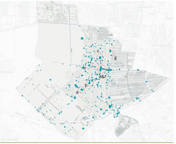 Het valt op dat het merendeel van de ongevallen in Waddinxveen op doorgaande- of ontsluitingsroutes plaatsvindt. De locaties met de meeste ongevallen (5 ongevallen of meer) in de periode januari 2018 t/m december 2022 zijn (de letters komen overeen met de locatie in Figuur 19):