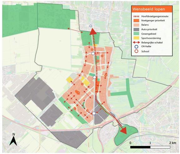 Tot slot leidt het voetgangersnetwerk tot verschillende mate aan voetgangersprioritering per locatie. Er is hier onderscheid gemaakt in drie typen gebieden: Voetganger prioriteit (1), balans (2) en auto prioriteit (3), waar zoals de naamgeving al aangeeft de prioriteit voor de voetganger per type gebied afneemt. Dit betekent in praktijk dat gebieden waar de voetganger prioriteit heeft rondom een aantal belangrijke bestemmingen is. In het gebied rondom scholen, (sport)verenigingen, winkelcentra, OV-haltes en ouderenvoorzieningen heeft de voetganger altijd prioriteit. Dit betekent dat de voetganger hier voorrang heeft en de andere vervoerswijzen, met name de gemotoriseerde voertuigen, te gast of afwezig zijn. Er zijn goede voetgangersvoorzieningen in de vorm van brede trottoirs en zebrapaden, maar ook bankjes en prullenbakken zijn aanwezig. Gemotoriseerde voertuigen mogen hier nooit harder dan 30 km/uur. Ook de hoofdvoetgangersroute maakt deel uit van de eerste categorie.