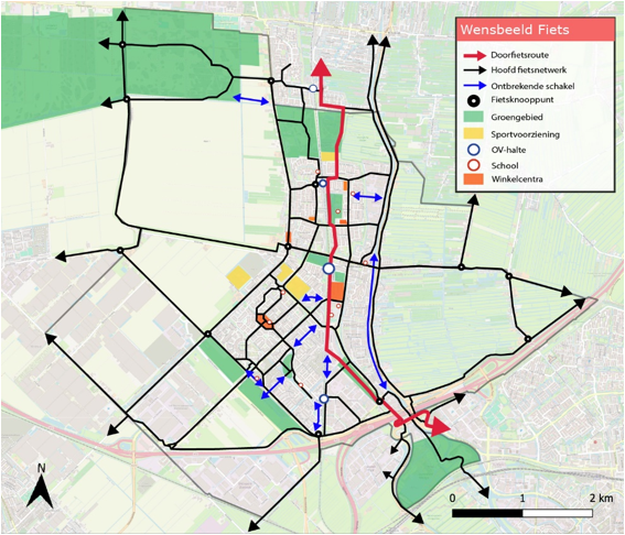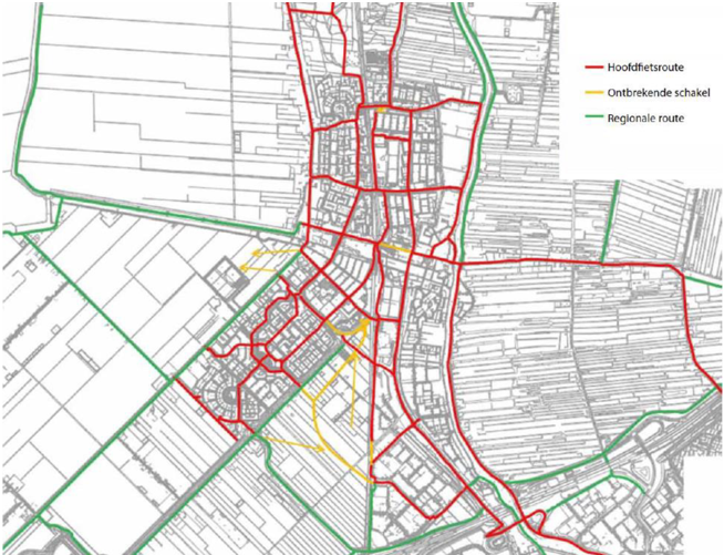In het wensbeeld zijn deze missende schakels ingetekend. Naast deze zogenaamde missende schakels is het realiseren van voldoende brede fietsvoorzieningen langs de zogenaamde binnenring (Juliana van Stolberglaan, Willem de Zwijgerlaan, Chopinlaan, Esdoornlaan, Dreef, Kanaaldijk ten noorden van de Dreef en Kanaalstraat) gewenst.