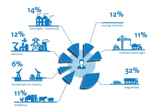 Figuur 3 Bijdrage van de grootste binnenlandse bronnen van luchtverontreiniging (Bron: SLA)