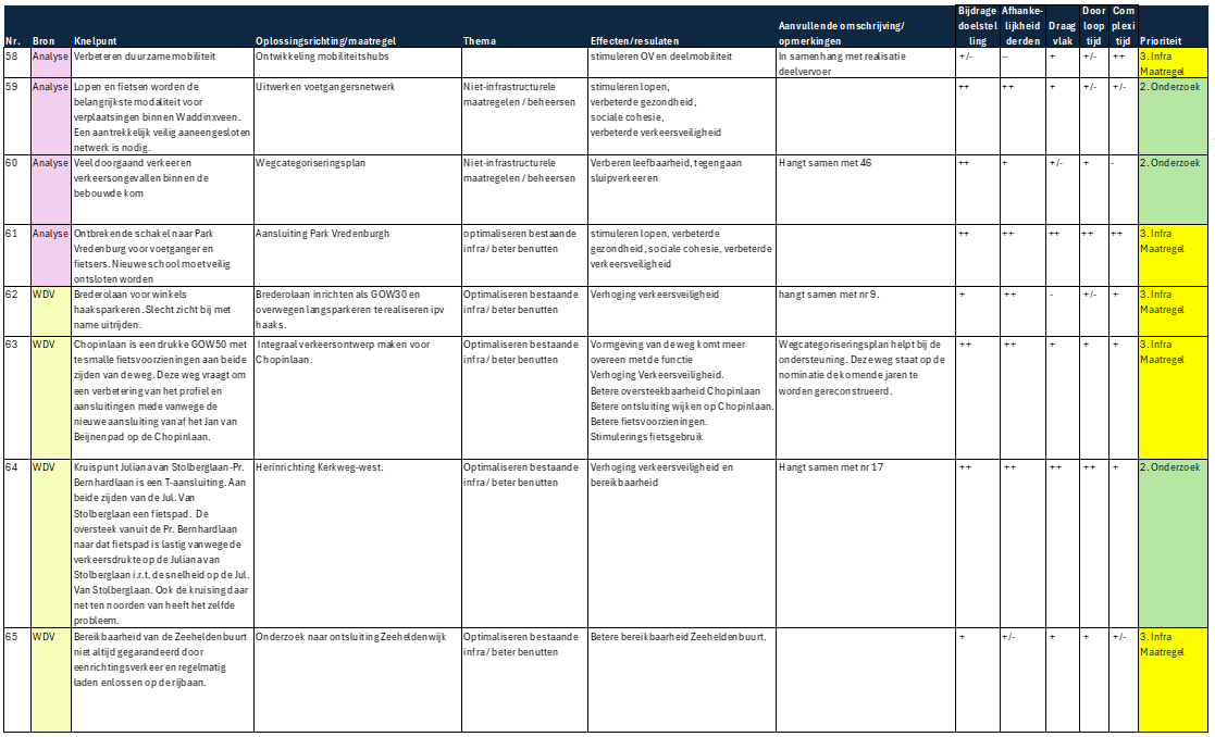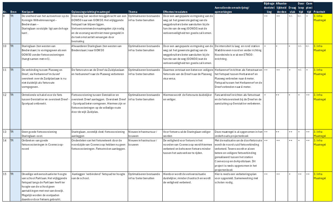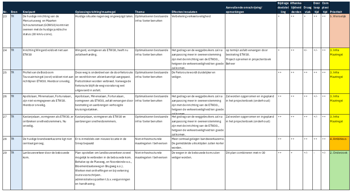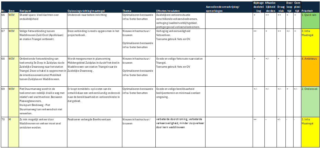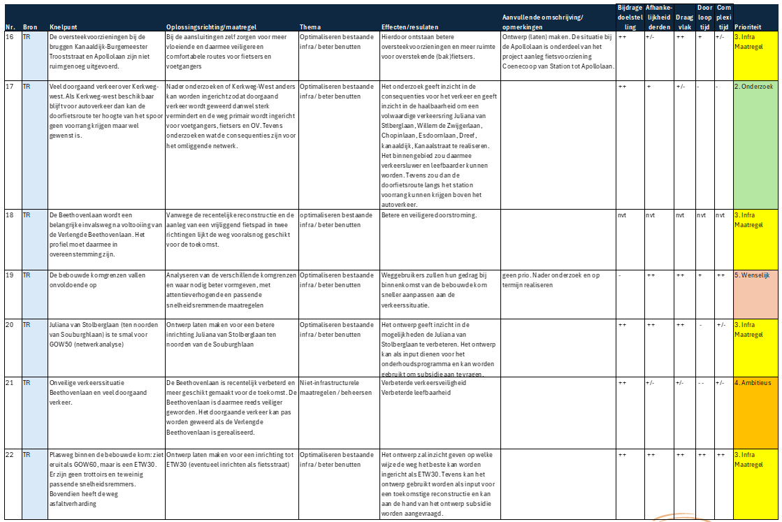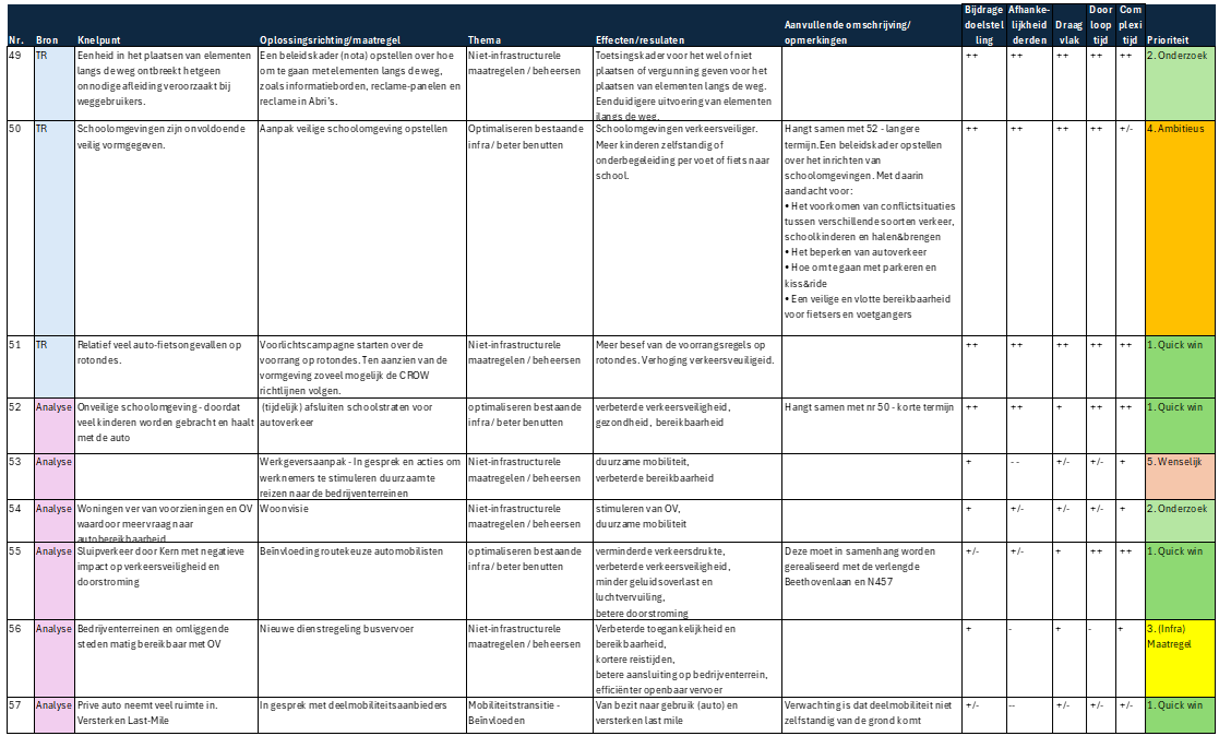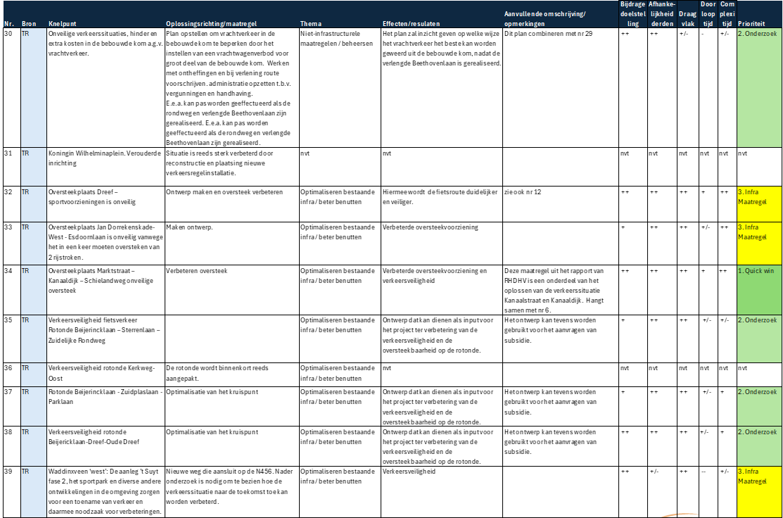 Infrastructurele maatregelen – Maatregelen die fysieke aanpassingen of uitbreidingen van infrastructuur vereisen. Deze projecten hebben een langere doorlooptijd vanwege het ontwerp, de financiering, vergunningsprocedures en uitvoeringsfase. Ze zijn vaak essentieel voor structurele verbeteringen in de mobiliteit. De maatregelen zijn nodig maar niet direct urgent.