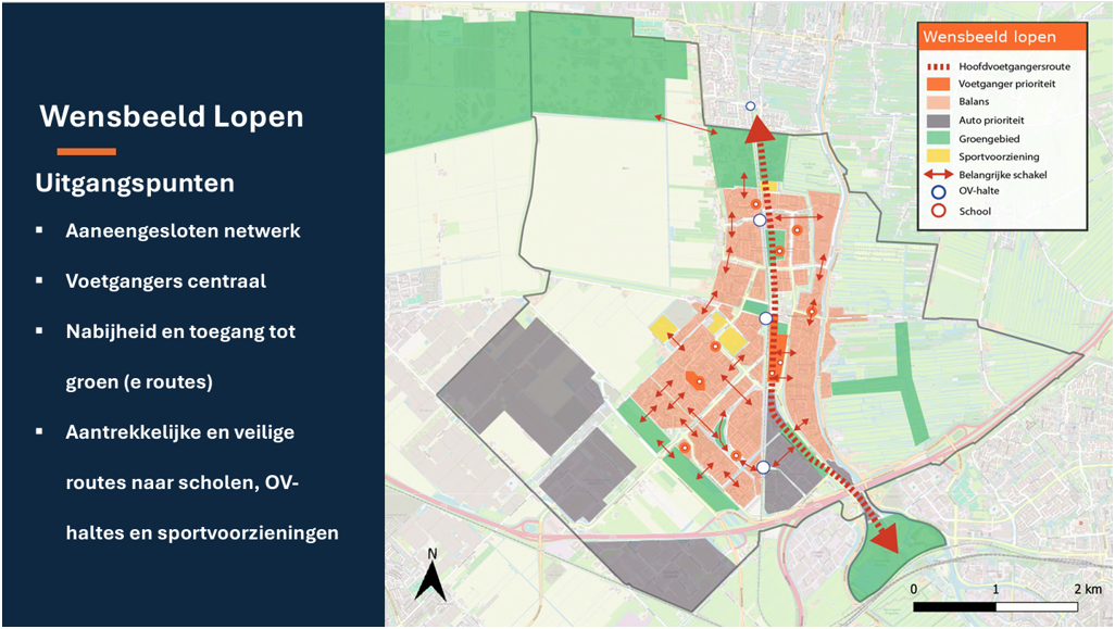 Om lopen als vervoersmiddel te stimuleren, werken we aan een aaneengesloten netwerk van (verkeers)veilige en aantrekkelijke (groene) wandelroutes. Dit houdt in dat woonwijken en belangrijke voorzieningen op een veilige en uitnodigende manier met elkaar verbonden worden via kwalitatieve wandelpaden. Hierbij ligt de nadruk op locaties zoals scholen, winkelcentra, OV-haltes, sportfaciliteiten en ouderenvoorzieningen. Daarnaast is ook een goede toegang tot het groene buitengebied essentieel. Belangrijke schakels moeten bestaande obstakels, zoals spoorlijnen en autowegen, op een veilige manier overbruggen en de wandelroutes moeten kwalitatief vormgegeven worden.