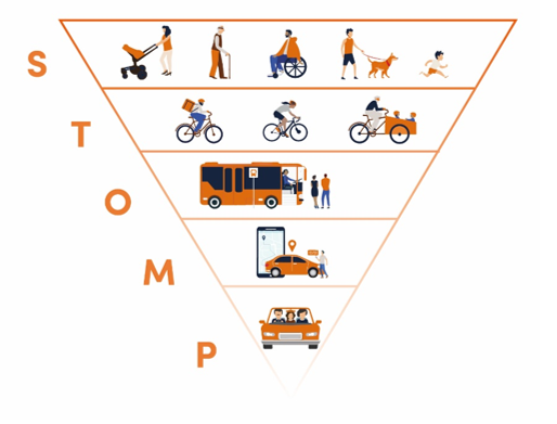De gemeente Waddinxveen stelt het STOMP-principe centraal bij het opstellen van het omgevingsprogramma. Hierbij wordt actief en duurzamer vervoer geprioriteerd boven de auto. Er wordt hierbij eerst naar de voetganger gekeken (Stappen), vervolgens naar de fietser (Trappen), het openbaar vervoer (OV), mobiliteitsdiensten zoals deelmobiliteit (Mobility as a Service) en tot slot de Particuliere auto. (Figuur 4) Bij het opstellen van het omgevingsprogramma voor de gemeente wordt deze volgorde in prioriteit aangehouden.
