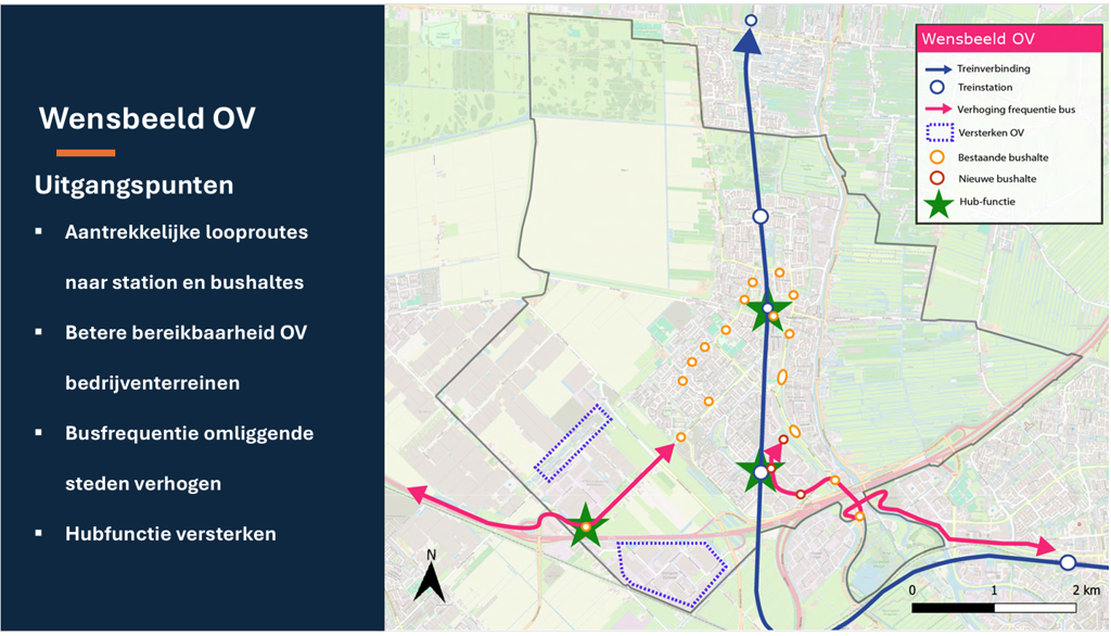 Concreet betekent dit een busnetwerk met aantrekkelijke frequenties en met goede aansluitingen op de treintijden. Daarbij moet naast de kern van Waddinxveen ook gezocht worden om de bedrijventerreinen beter te ontsluiten op het openbaar vervoer. De gemeente Waddinxveen heeft hier niet direct invloed op, maar kan via lobbywerk afspraken maken met de provincie (opdrachtgever van het openbaar vervoer) of de vervoerders. Waar binnen de gemeentegrenzen gaten vallen in het busnetwerk kan worden ingezet op alternatieven zoals een belbus of deelfietsen.