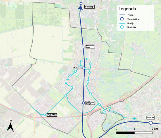 Naast de trein beschikt Waddinxveen over vier buslijnen. Hiervan zijn er drie spitssnelbussen, namelijk lijnen 382, 384 (beiden Waddinxveen-Den Haag) en 386 (Gouda-Den Haag). Lijn 175 rijdt tussen Gouda Station en Rotterdam Nesselande en stopt op 14 haltes in de gemeente Waddinxveen. Deze is ook weergegeven in Figuur 9, samen met de treinstations.