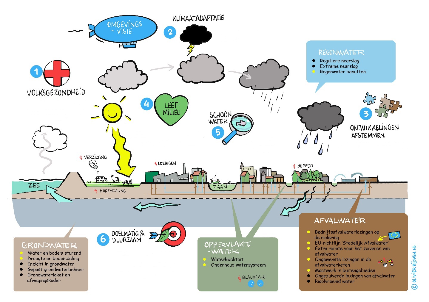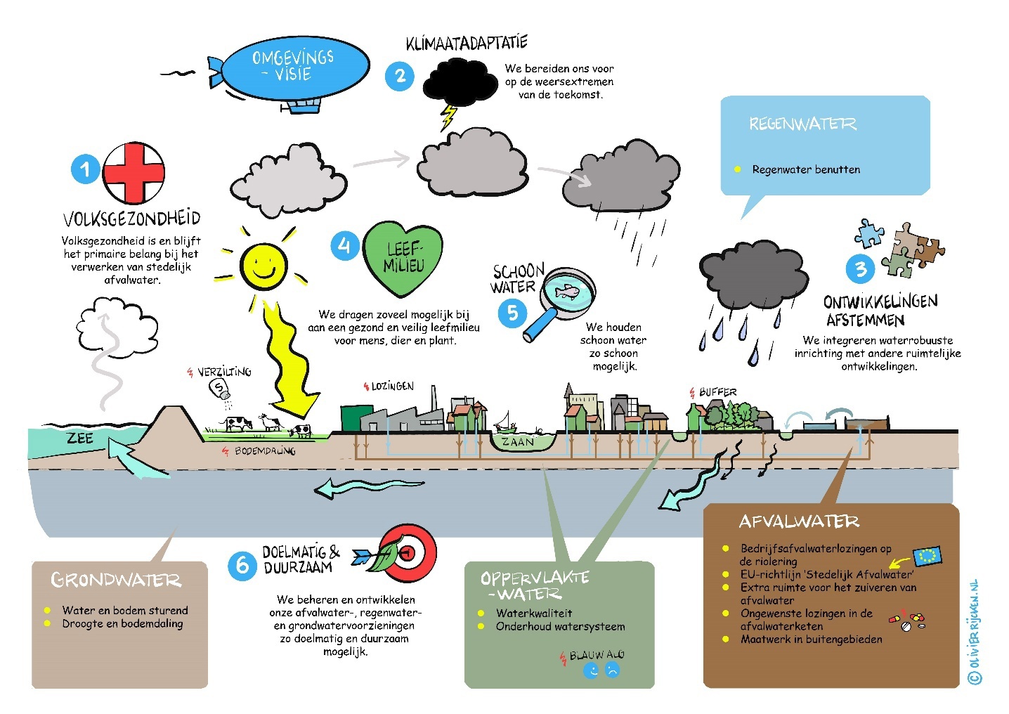 Meer dan de helft van het rioolstelsel in Zaanstreek-Waterland bestaat uit een gemengd stelsel, waarbij vuilwater en regenwater door één buis worden afgevoerd. Het vuilwater wordt hierdoor verdund en het relatief schone regenwater raakt vervuild. Bij hevige neerslag kan het riool overlopen. Bij zo’n overstorting komt het vervuilde gemengde water in open water terecht. Bij vervanging van riolering wordt indien mogelijk, een gescheiden rioolstelsel aangelegd, waarbij vuilwater en regenwater gescheiden worden afgevoerd. Relatief schoon regenwater kan zo ook lokaal worden gebruikt om droogte tegen te gaan.