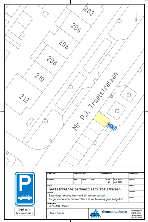 Verkeersbesluit gereserveerde parkeerplaats deelauto Troelstralaan 210