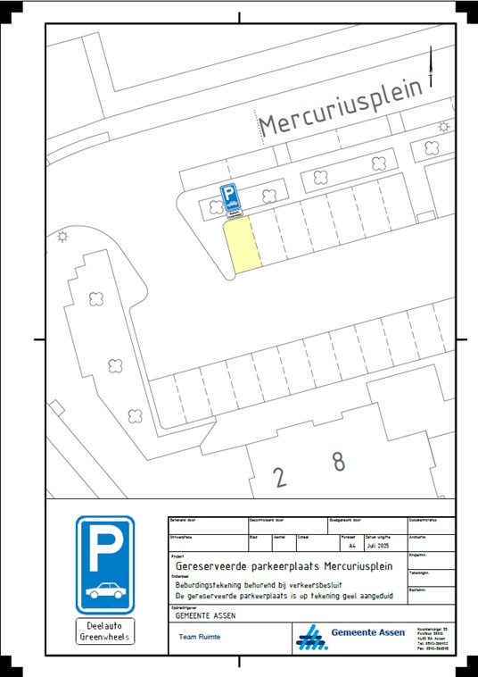 Het plaatsen van bord E8 uit bijlage 1 van het RVV 1990 met onderbord met daarop de tekst ‘’Deelauto Greenwheels’’ nabij Mercuriusplein 2 overeenkomstig op de bij dit besluit behorende situatieschets.