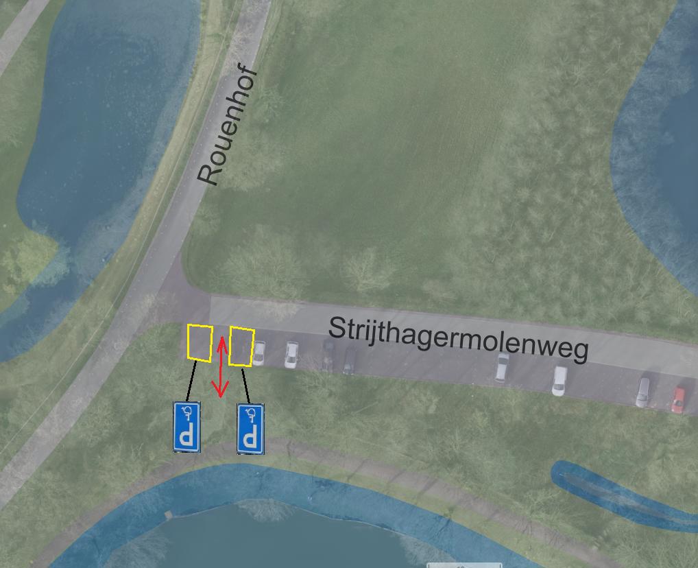 Om te kunnen voorzien in de behoefte aan een parkeerplaats voor gehandicapten, wordt overgegaan tot de aanleg van twee algemene gehandicaptenparkeerplaatsen. Hiertoe zullen twee reguliere parkeerplaatsen, gelegen op de parkeervakken aan de Strijthagermolenweg, worden ingericht als algemene gehandicaptenparkeerplaats. Afgelopen jaar is er een pad gemaakt vanuit Strijthagermolenweg naar de vijvers toe. Dit pad is rolstoeltoegankelijk. De twee nieuwe gehandicaptenparkeerplaatsen liggen aan weerszijden van dit pad. Op deze manier zijn ze zo dicht mogelijk bij de vijvers gesitueerd.