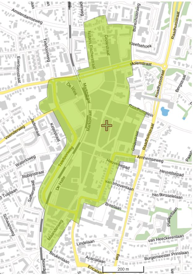 Achterdoelen - Doelenplein - Raadhuisplein - Oude Kerkplein - Driehoek ( huisnummer10A tot Molenstraat) - Molenstraat (huisnummer 11 tot Bunschoterweg) - Bunschoterweg (vanaf Molenstraat tot Verlengde Amsterdamseweg) - Verlengde Amsterdamseweg - Bospoort (huisnummer 1 t/m 3) - Amsterdamseweg (vanaf Grotestraat tot Notaris Fischerstraat) - Notaris Fischerstraat - Molenstraat (vanaf Notaris Fischerstraat tot Telefoonweg) - Telefoonweg (vanaf Molenstraat tot Stationsweg) - Veenderweg huisnummer (2-4 even), Maanderweg - Stationsweg ( huisnummer 24 tot Breelaan) - Breelaan (vanaf Stationsweg t/m huisnummer 3) – Detmarlaan - Van Irhovenlaan 16 - Arnhemseweg (vanaf Detmarlaan tot huisnummer 16).