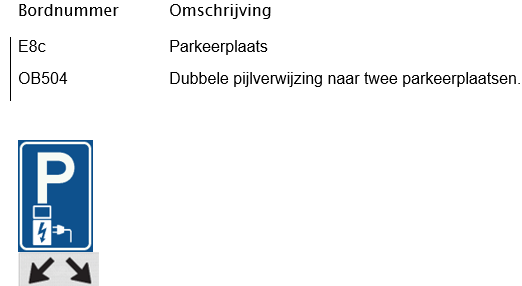 telkens twee parkeerplaatsen aan te wijzen als parkeerplaats ten behoeve van het opladen van elektrische voertuigen. Dit gebeurt middels bord (E8c) met een onderbord.