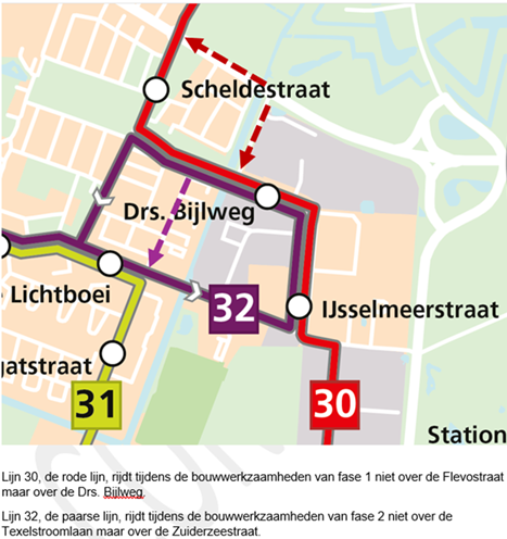 De Texelstroomlaan tussen de Waddenzeestraat en de IJsselmeerstraat (590 m) wordt in twee fasen gereconstrueerd van 50GOW naar 30GOW. Een uitvoering in één keer zou betekenen dat de hele weg langdurig afgesloten is, met grote gevolgen voor bereikbaarheid en verkeersveiligheid. Door de werkzaamheden te splitsen in twee fasen blijft steeds een deel van de weg toegankelijk, wat de overlast voor bewoners, bedrijven en weggebruikers aanzienlijk beperkt.