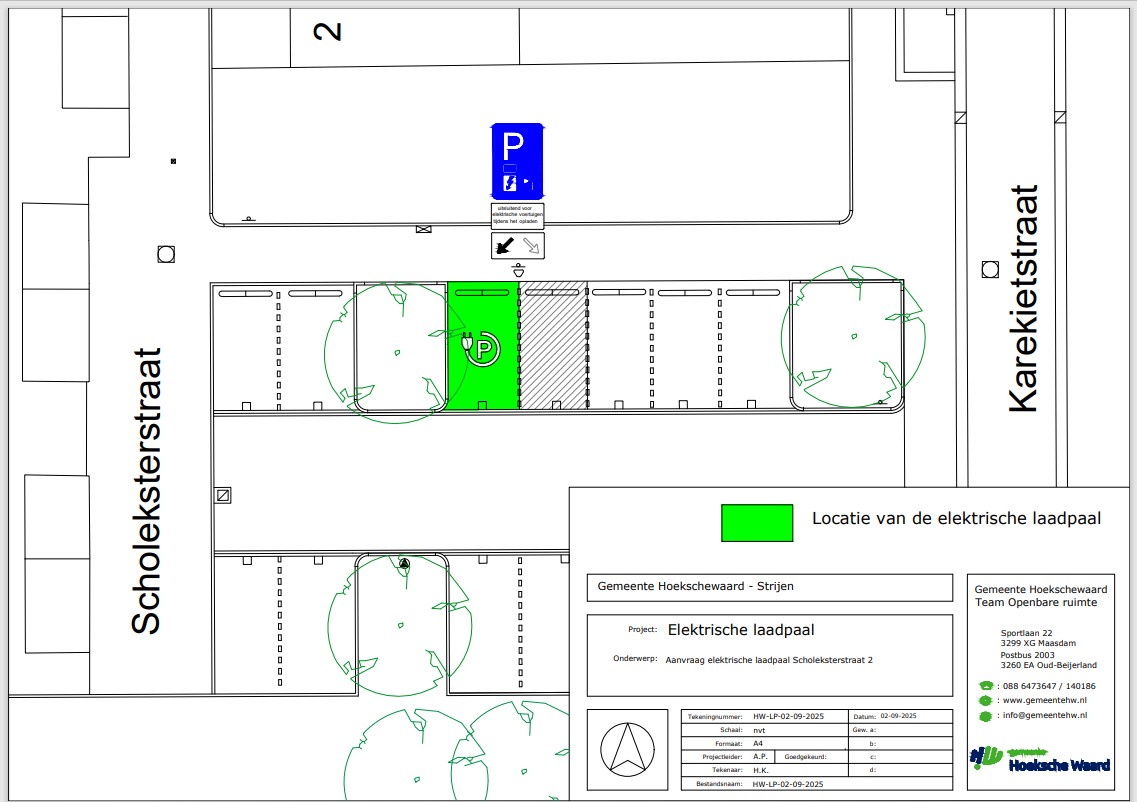 Twee parkeerplaatsen aan te wijzen voor het uitsluitend opladen van elektrische voertuigen, waarbij aanvankelijk slechts één parkeerplaats wordt geëffectueerd. Dit door middel van het plaatsen van het bord E8c van het RVV (Reglement Verkeersregels en Verkeerstekens 1990) voorzien van het onderbord met de tekst ” Uitsluitend voor elektrische voertuigen tijdens het opladen”.