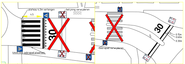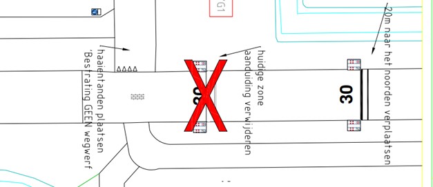 Het verplaatsen van de voetgangersoversteekplaats op de Veenweg door het verwijderen van de borden L02 inclusief zebra markering en het plaatsen van de borden L02 inclusief zebra markering en het verplaatsen van de 30km/u zone (A130ZB en A130ZE) poortconstructie op de Veenweg, conform onderstaande afbeelding.