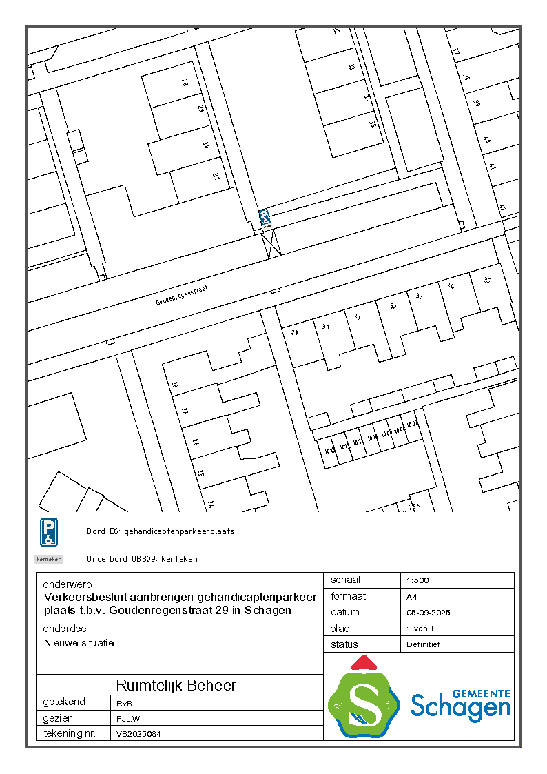 Het plaatsen van het bord E6 van de bijlage 1 van het RVV 1990 inhoudende “gehandicaptenparkeerplaats” en deze te voorzien van een onderbord met daarop het kenteken van het voertuig, ter hoogte van perceel Goudenregenstraat 29, Schagen.