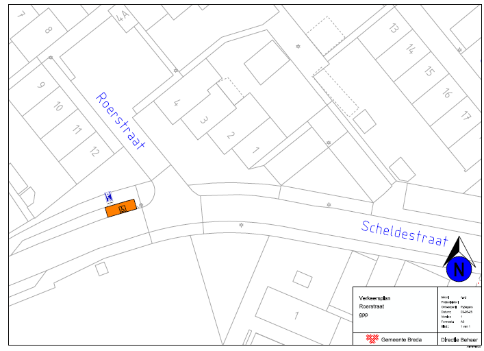 Een gehandicaptenparkeerplaats op kenteken aan te wijzen in de Scheldestraat te Breda. Een en ander zoals weergegeven op de bijgevoegde tekening ‘Verkeersplan Roerstraat gpp’.