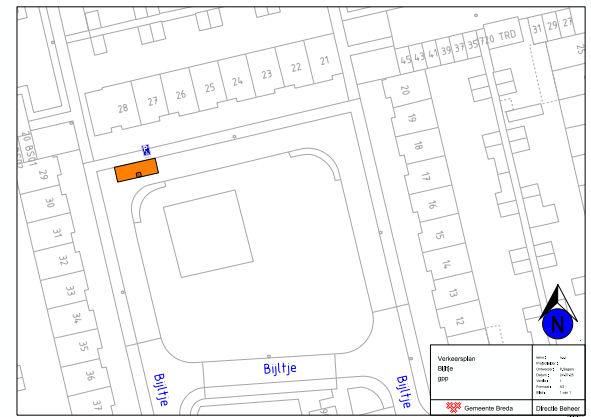 Een gehandicaptenparkeerplaats op kenteken aan te wijzen op het Bijltje ter hoogte van huisnummer 28 te Breda. Een en ander zoals weergegeven op de bijgevoegde tekening ‘Verkeersplan Bijltje gpp’.