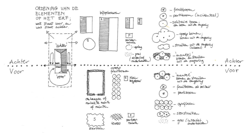 Principe erfinrichting - kavel A (bestaand) - kavel B (nieuw). Op de volgende pagina wordt dieper ingegaan op de karakteristieke kenmerken van een voor- en achtererf, zoals ook aangeduid op bovenstaande schets.