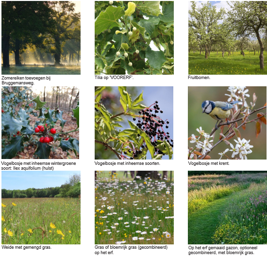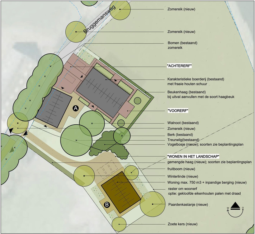 De walnoot karakteristiek voor veel Twentse erven, de treurwilg karakteriseert de relatie met het water van de beek. Langs de Bruggemansweg staan eikenbomen, deze worden ter plaatse van de twee te slopen schuren, deels aangevuld langs het erf. Op het ‘ACHTER-ERF’ wordt een solitaire boom toegevoegd van de eerste grootte. Er valt hierbij te denken aan een winterlinde: Tilia cordata. Op het nieuwe woonerf (kavel B) staan nu geen bomen. Hier moeten ten minste 4 bomen aangeplant worden; er valt hierbij te denken aan een linde, zomereik, kastanje, fruitboom. Wenselijk is het om te kiezen voor een mix aan bomen. Niet in een vast stramien, maar vrijstaand, als solitair in het landschap. Ter versterking van de biodiversiteit, bevordering schaduw en inpassing van ‘woonschuur’ in landschap.