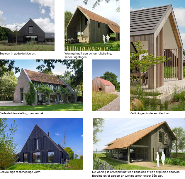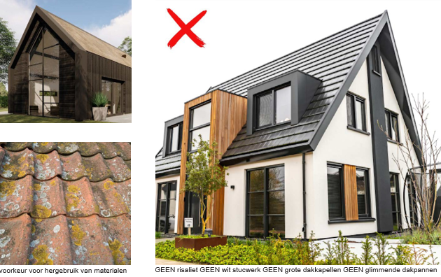 Dak: natuurlijke tinten, een bruin tot antracietkleurig keramische pan of een vegetatiedak. Een glimmende of spiegelende dakafwerking is niet toegestaan. Geen contrasterende bouwdelen, geen witte dakranden.