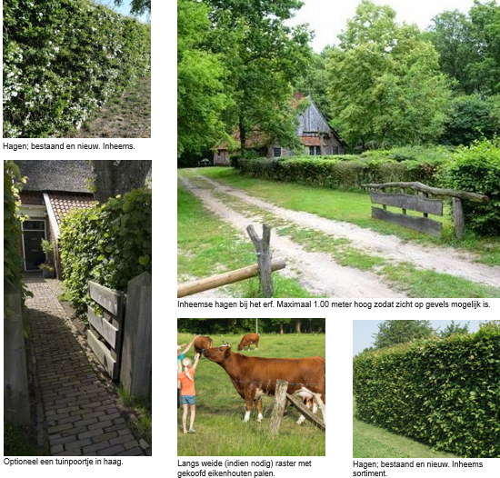 Bij het woonerf is er kavel A sprake van behoud van een bestaande haag. Bij kavel B komt er om samenhang te generen een nieuwe haag. De bestaande haag bij erf A: Fagus sylvatica (beuk) mag behouden worden of herplant met een inheemse (bladverliezende) soort. Erf B is nieuw en moet 50% familiair zijn aan het sortiment uit deze haag, overige 50% mag bestaan uit ander sortiment haagbeplanting, inheems, streekeigen; haagbeuk (Carpinus betulus), meidoorn (Crataegus monogyna), Hondsroos (Rosa canina), Veldesdoorn (Acer campestre). De hagen op het erf hebben een maximale hoogte van 1.10 meter.
