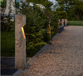 Verlichting op het erf is schaars, laag, en naar beneden gericht en waar mogelijk aan gevels.