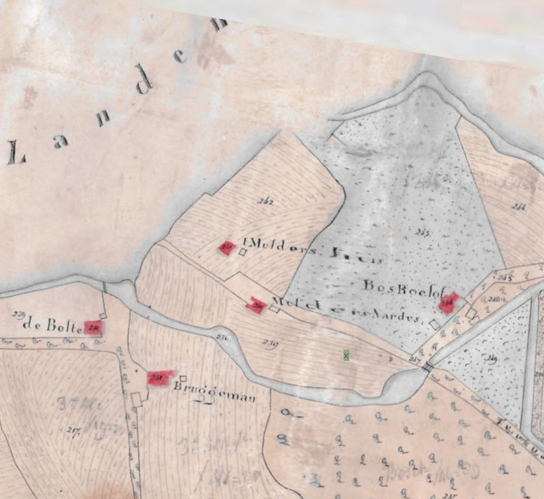 Op de historische topografische kaarten (zie volgende pagina) en de Schukkingkaart van 1821, de eerste beheerskaart van Weleveld (hiernaast afgebeeld), is duidelijk te zien dat de beken steeds een ander natuurlijk verloop hadden.