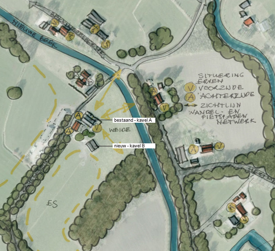 Beide kavels hebben naast de woonkavel een perceel agrarische grond, beiden grenzend aan de beek. Ruimtelijk gezien vormen deze kavels samen een compact erf. Op de volgende pagina’s worden de uitgangspunten op onderdelen nader toegelicht.